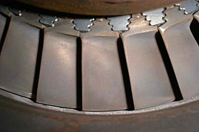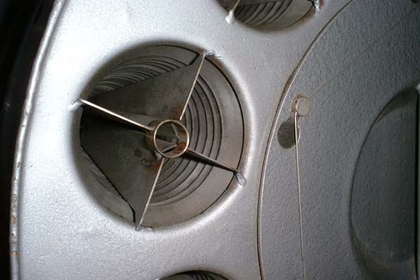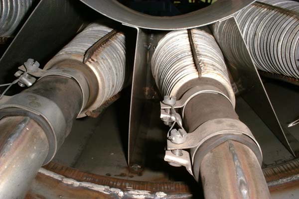 That’s a rear view of the dust/air separator. Each one of the ring stacks ends in a pipe segment that is connected to a circular cavity from which the air is scavenged throught the oval port at the left. A more detialed photo of the ring stacks is shown below.
