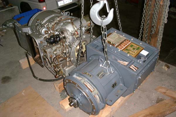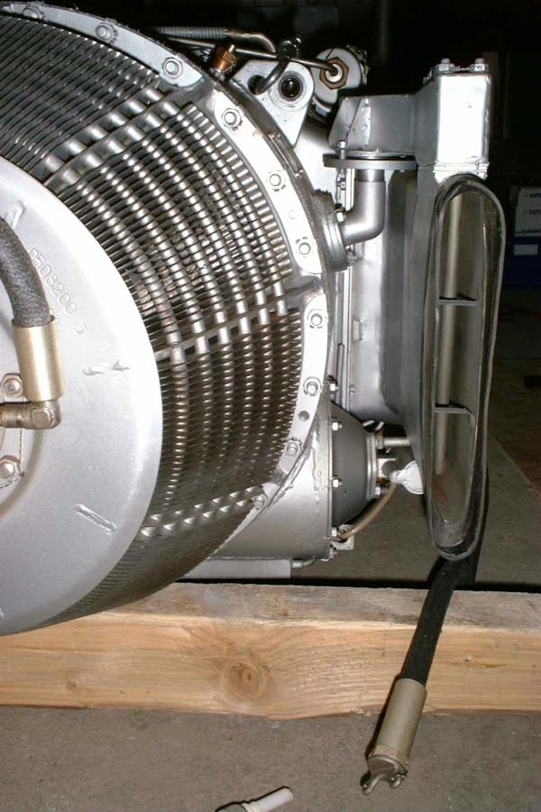 The engine is separated from the alternator. It’s a compact unit but still has considerable size (about 45cm in diameter, 90cm long and weighs a guessed 150kg). Yet it seems to be a completely self-sufficient unit with integrated oil system and tank. The black hose in front of the unit is the oil drain, a nice idea to have it arranged this way, simply place the hose in a suitable container and open the drain valve - no hassle, no mess of spilled oil. If the engine is placed on the gearbox flange (vertically), it reminds me of “R2D2”... ;-)