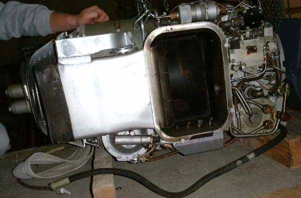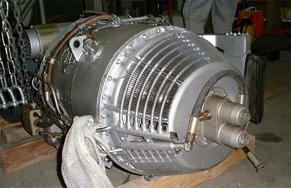 The compressor end of the engine with the dust separator removed. There’s an oil cooler arranged around the compressor intake, probably a result of the arrangement of the gearbox at the hot section. The two cans at the compressor front contain the oil filters I guess.