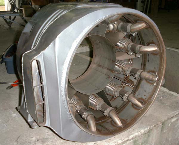 And then...cold motoring for a short time...automatic start activated...ignition. The Russian bear broke loose! It’s hard to describe the intense sound this engine produces. During accelerating from about 30...70%, the compressor produces a ground-shaking hum to burst into a terrific roar afterwards. The hum somewhat reminds me of an Allison 250, but this beast is much louder. It’s simply evil. I’m pretty sure, if I ran my GTP30 side-by-side with this monster, the Garrett wouldn’t be heard at all. I guess the 2PW8 emits at least half of its power as noise... ;-). Now here are four video clips of the runs. I adjusted the camera a little bad so our heads are clipped in the first two videos (which isn’t a real loss...). The first start (1.6MB) was terminated at approx. 70% rpm as the exhaust flux started to stir up the small stones the place in front of Jürgen’s hall is paved with. I was afraid this debris would be drawn into the compressor so I signalled Jürgen to stop the engine For the consequent starts, we placed a sheet metal plate on the ground in front of the exhaust port. The second start (1.9MB) was continued up to governed RPM. Due to the extreme noise and the excitement, we simply forgot to memorize the instrument readings. So we conducted a third run (1.7MB), this time the camera pointed at the control panel. It becomes clear that the tacho generator is a four-pole machine since governed RPM equals approx. 82Hz. EGT maxed during startup just short of 700°C and dropped slightly below 300°C while the engine was idling - not too bad. Yet it is to consider that it was pretty cold this day, about 0°C, so EGT during “standard conditions” will be somewhat higher. A little later we started the engine for a fourth time (2.1MB) to let it run a little longer until the “engine ready” light came on. This time the camera was placed at the other side and it becomes clear how intense the jet efflux is - the metal sheet is wobbling and slowly creeps from the engine even though a stone is placed at the front to keep it from moving. Jürgen is going to construct an exhaust duct to do away with the problem of the exhaust stirring up the ground. It might be a good idea to point the duct slightly upward. What’s quite interesting is that the engine consumed four litres (one gallon) of diesel fuel for just the four starts to be seen in the videos. Considering this and that almost no smoke is visible, the engine seems to be burning the fuel quite cleanly. To view the videos, you will need the DIVX codec. You can get it here: http://www.divx.com/divx/ If the audio remains quiet (what’s a turbine video worth when the sound is missing??...), please search the web for “tsunami codec pack” and start the installation program. Select “Custom” installation and be sure to check only the “Windows Media Audio Decoder” box. Of course you may select other decoders as well in case you need them. After this procedure, the videos should play properly. It’s really sad that the camcorder sound wouldn’t even get near the actual sensation of noise this engine produces... I guess if I hadn’t already had some experience with other gas turbines, I would have s**t my pants while starting this one ;-).