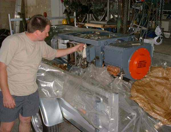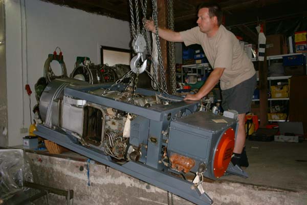 Using Jürgen’s workshop crane, the engine is lifted off the trailer and placed on the step in his workshop. In the background, the two Ru19a-300 engines are visible. This was a somewhat risky task because the whole genset is very heavy. The label states 470kg (about 1050lbs).