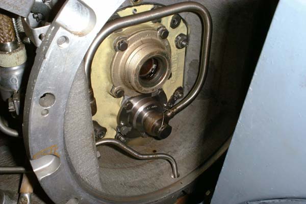 That’s the power takeoff at the gearbox end of the engine. Since there’s an open shaft seal that fits the alternator shaft coupling, a cover needs to be made that screws onto the thread at the outside of the bearing retainer to keep oil from being spilled from this orifice. I’m sure it was arranged this way to keep both splined couplings of the quill shaft (one in the drive shaft of the engine and the other inside the shaft of the alternator) lubricated with engine oil.